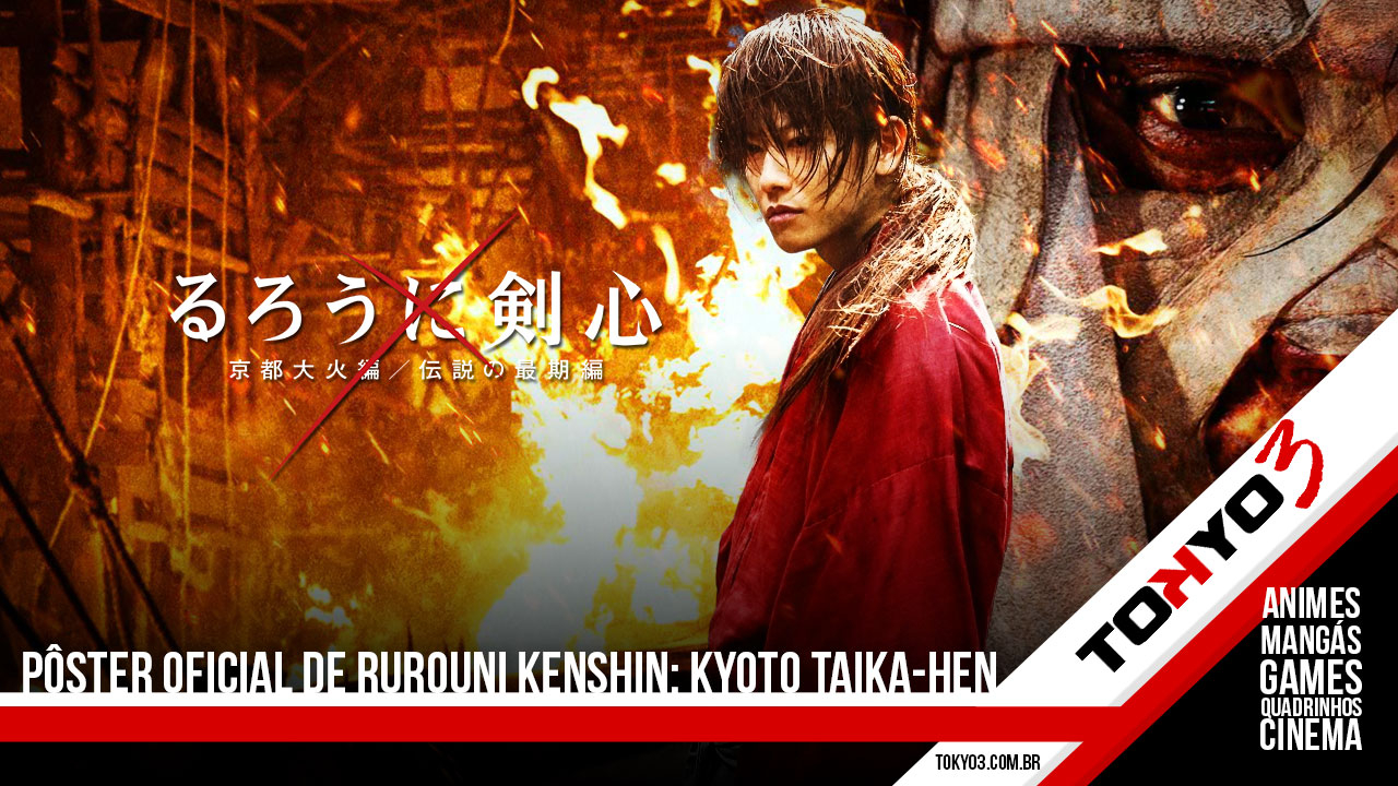 Hoje, mais cedo, através das redes sociais (Facebook, Twitter), foi divulgado o pôster oficial de Rurouni Kenshin: Kyoto Taika-hen. Nesta arte observamos Kenshin pronto para batalha contra um inimigo extremamente poderoso, Makoto Shishio, em um cenário completamente destruído.
